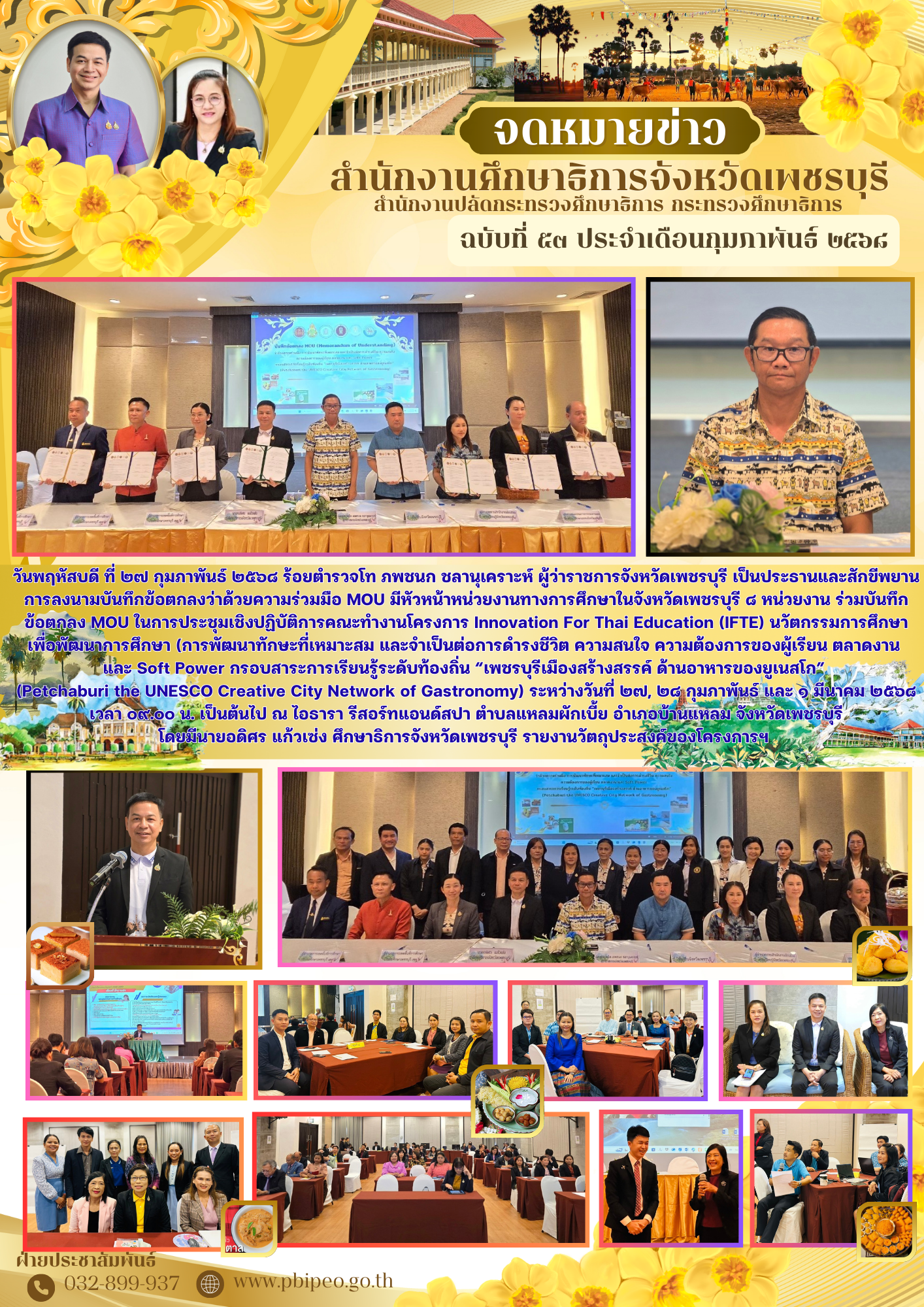 ประชุมเชิงปฏิบัติการคณะทำงานโครงการ Innovation For Thai Education (IFTE) นวัตกรรมการศึกษา เพื่อพัฒนาการศึกษา (การพัฒนาทักษะที่เหมาะสม และจำเป็นต่อการดำรงชีวิต ความสนใจ ความต้องการของผู้เรียน ตลาดงาน และ Soft Power กรอบสาระการเรียนรู้ระดับท้องถิ่น “เพชรบุรีเมืองสร้างสรรค์ ด้านอาหารของยูเนสโก” (Petchaburi the UNESCO Creative City Network of Gastronomy)