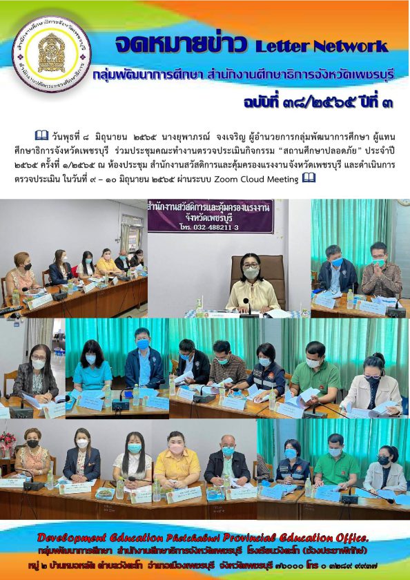 วันพุธที่ 8 มิถุนายน 2565 นางยุพาภรณ์ จงเจริญ ผู้อำนวยการกลุ่มพัฒนาการศึกษา ผู้แทนศึกษาธิการจังหวัดเพชรบุรี ร่วมประชุมคณะทำงานตรวจประเมินกิจกรรม “สถานศึกษาปลอดภัย” ประจำปี 2565 ครั้งที่ 1/2565 ณ ห้องประชุม สำนักงานสวัสดิการและคุ้มครองแรงงานจังหวัดเพชรบุรี และดำเนินการตรวจประเมิน ในวันที่ 9 – 10 มิถุนายน 2565 ผ่านระบบ Zoom Cloud Meeting