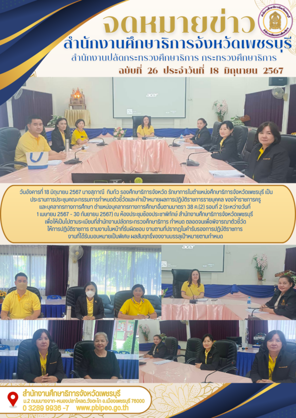 วันอังคารที่ 18 มิถุนายน 2567 นางสุภาณี กิมกัว รองศึกษาธิการจังหวัด รักษาการในตำแหน่งศึกษาธิการจังหวัดเพชรบุรี เป็นประธานการประชุมคณะกรรมการกำหนดตัวชี้วัดและค่าเป้าหมายผลการปฏิบัติราชการรายบุคคล ของข้าราชการครูและบุคลากรทางการศึกษา ตำแหน่งบุคลากรทางการศึกษาอื่นตามมาตรา 38 ค.(2) รอบที่ 2 (ระหว่างวันที่ 1 เมษายน 2567 – 30 กันยายน 2567) ณ ห้องประชุมช้องประชาพิทักษ์ สำนักงานศึกษาธิการจังหวัดเพชรบุรี เพื่อให้เป็นไปตามระเบียบที่สำนักงานปลัดกระทรวงศึกษาธิการ กำหนด ตลอดจนเพื่อพิจารณาตัวชี้วัดให้การปฏิบัติราชการ ตามงานในหน้าที่รับผิดชอบ งานตามที่ปรากฎในคำรับรองการปฏิบัติราชการ งานที่ได้รับมอบหมายเป็นพิเศษ ผลสัมฤทธิ์ของงานบรรลุเป้าหมายตามกำหนด