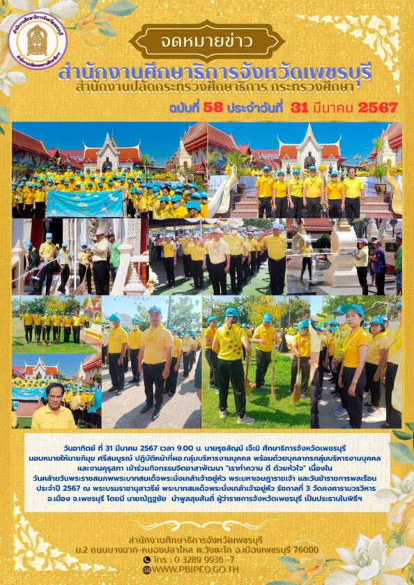 ันอาทิตย์ ที่ 31 มีนาคม 2567 เวลา 9.00 น. นายรุซลัญน์ เจ๊ะมิ ศึกษาธิการจังหวัดเพชรบุรี มอบหมายให้นายภิมุข ศรีสมบูรณ์ ปฏิบัติหน้าที่ผอ.กลุ่มบริหารงานบุคคล พร้อมด้วยบุคลากรกลุ่มบริหารงานบุคคลและงานคุรุสภา เข้าร่วมกิจกรรมจิตอาสาพัฒนา “เราทำความ ดี ด้วยหัวใจ” เนื่องในวันคล้ายวันพระราชสมภพพระบาทสมเด็จพระนั่งเกล้าเจ้าอยู่หัว พระมหาเจษฎาราชเจ้า” และวันข้าราชการพลเรือน ประจำปี 2567 ณ พระบรมราชานุสาวรีย์ พระบาทสมเด็จพระนั่งเกล้าเจ้าอยู่หัว รัชกาลที่ 3 วัดคงคารามวรวิหาร อ.เมือง จ.เพชรบุรี โดยมี นายณัฏฐชัย นำพูลสุขสันติ์ ผู้ว่าราชการจังหวัดเพชรบุรี เป็นประธานในพิธีฯ