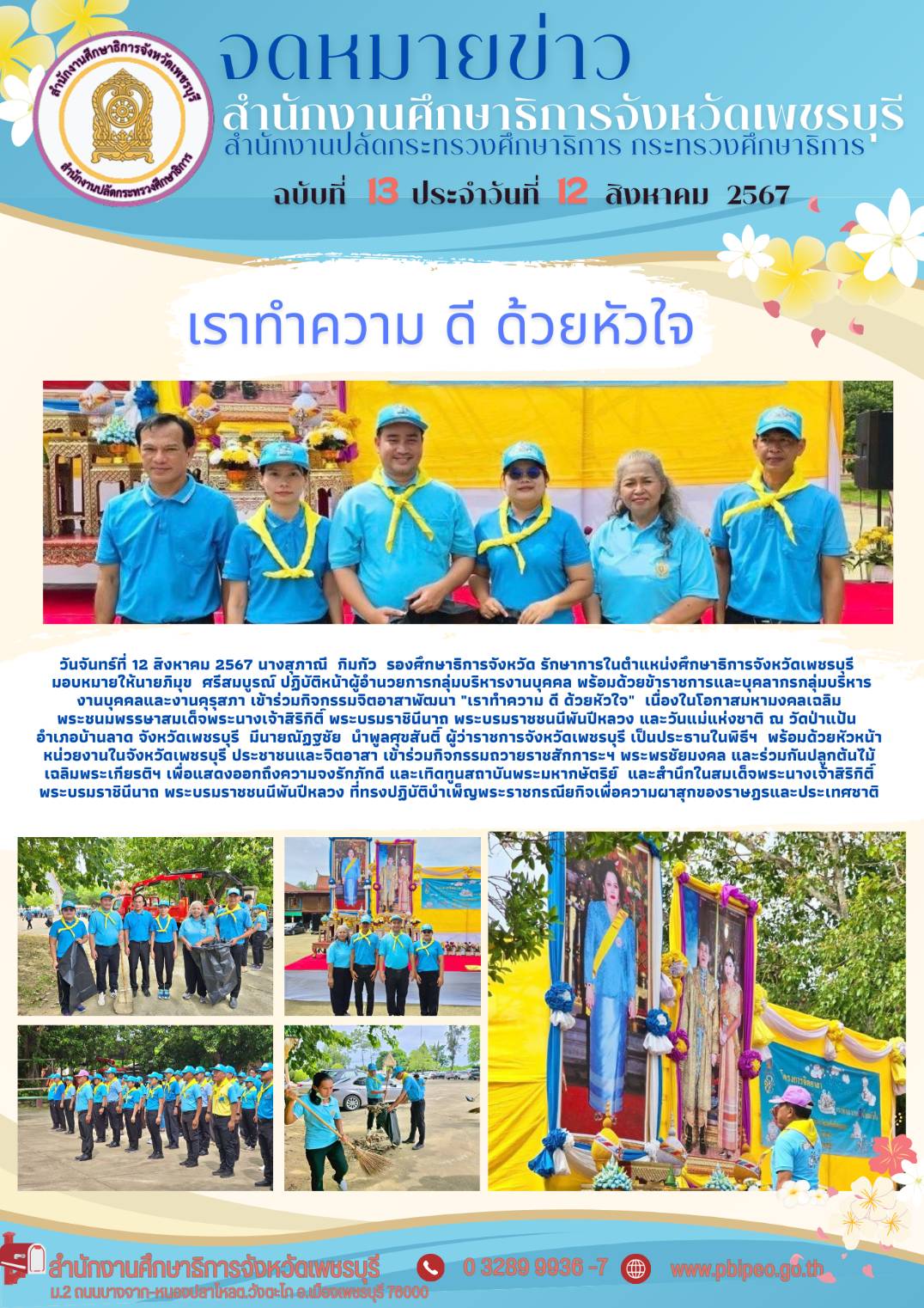 วันจันทร์ที่ 12 สิงหาคม 2567 นางสุภาณี กิมกัว รองศึกษาธิการจังหวัด รักษาการในตำแหน่งศึกษาธิการจังหวัดเพชรบุรี มอบหมายให้นายภิมุข ศรีสมบูรณ์ ปฏิบัติหน้าผู้อำนวยการกลุ่มบริหารงานบุคคล พร้อมด้วยข้าราชการและบุคลากรกลุ่มบริหารงานบุคคลและงานคุรุสภา เข้าร่วมกิจกรรมจิตอาสาพัฒนา “เราทำความ ดี ด้วยหัวใจ” เนื่องในโอกาสมหามงคลเฉลิมพระชนมพรรษาสมเด็จพระนางเจ้าสิริกิติ์ พระบรมราชินีนาถ พระบรมราชชนนีพันปีหลวง และวันแม่แห่งชาติ ณ วัดป่าแป้น อำเภอบ้านลาด จังหวัดเพชรบุรี มีนายณัฏฐชัย นำพูลศุขสันติ์ ผู้ว่าราชการจังหวัดเพชรบุรี เป็นประธานในพิธีฯ พร้อมด้วยหัวหน้าหน่วยงานในจังหวัดเพชรบุรี ประชาชนและจิตอาสา เข้าร่วมกิจกรรมถวายราชสักการะฯ พระพรชัยมงคล และร่วมกันปลูกต้นไม้เฉลิมพระเกียรติฯ เพื่อแสดงออกถึงความจงรักภักดี และเทิดทูนสถาบันพระมหากษัตริย์ และสำนึกในสมเด็จพระนางเจ้าสิริกิติ์ พระบรมราชินีนาถ พระบรมราชชนนีพันปีหลวง ที่ทรงปฏิบัติบำเพ็ญพระราชกรณียกิจเพื่อความผาสุกของราษฎรและประเทศชาติ