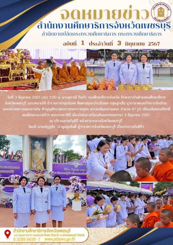 ทำบุญตักบาตรถวายพระราชกุศล พระสงฆ์และสามเณร จำนวน 47 รูป เพื่อเฉลิมพระเกียรติสมเด็จพระนางเจ้าฯ พระบรมราชินี เนื่องในโอกาสวันเฉลิมพระชนพรรษา 3 มิถุนายน 2567