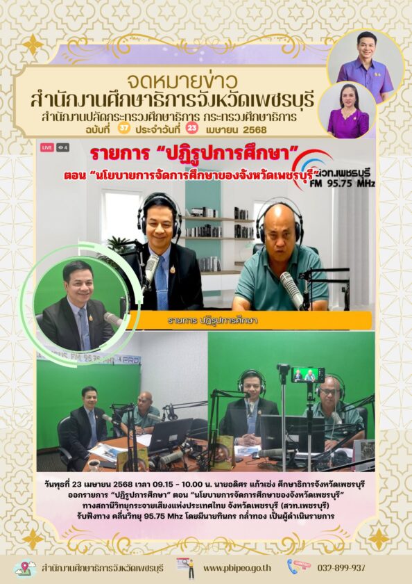 นายอดิศร แก้วเซ่ง ศึกษาธิการจังหวัดเพชรบุรี ออกรายการ “ปฏิรูปการศึกษา” ตอน “นโยบายการจัดการศึกษาของจังหวัดเพชรบุรี” ทางสถานีวิทยุกระจายเสียงแห่งประเทศไทย จังหวัดเพชรบุรี (สวท.เพชรบุรี)