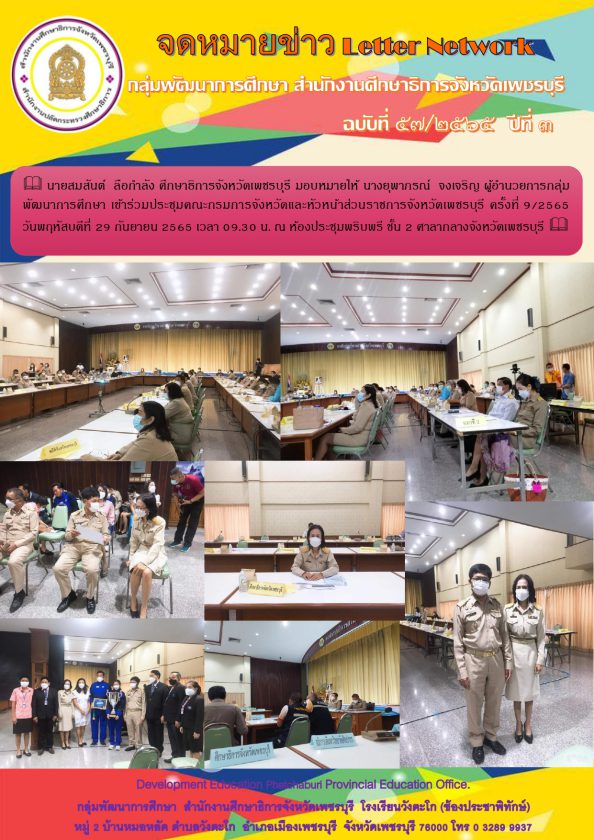 นายสมสันต์  ลือกำลัง ศึกษาธิการจังหวัดเพชรบุรี มอบหมายให้ นางยุพาภรณ์  จงเจริญ ผู้อำนวยการกลุ่มพัฒนาการศึกษา เข้าร่วมประชุมคณะกรมการจังหวัดและหัวหน้าส่วนราชการจังหวัดเพชรบุรี ครั้งที่ 9/2565  วันพฤหัสบดีที่ 29 กันยายน 2565 เวลา 09.30 น. ณ ห้องประชุมพริบพรี ชั้น 2 ศาลากลางจังหวัดเพชรบุรี