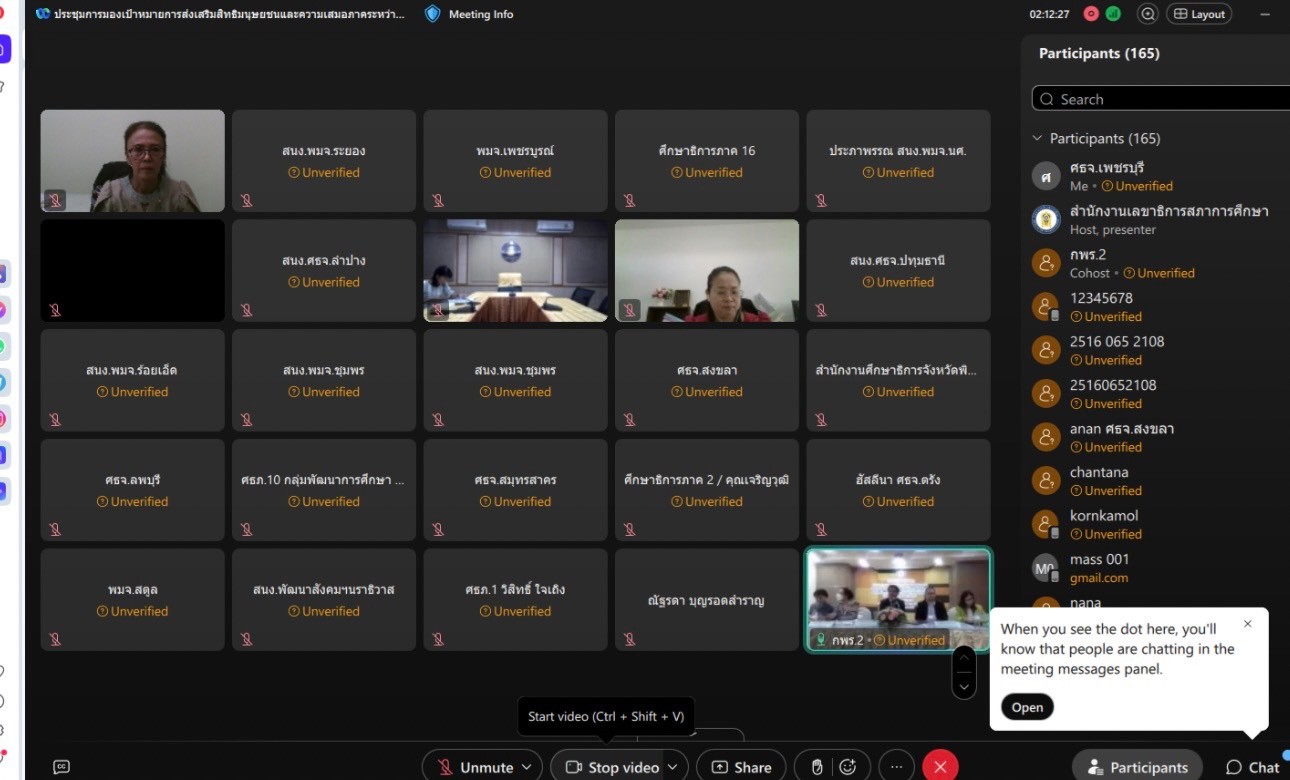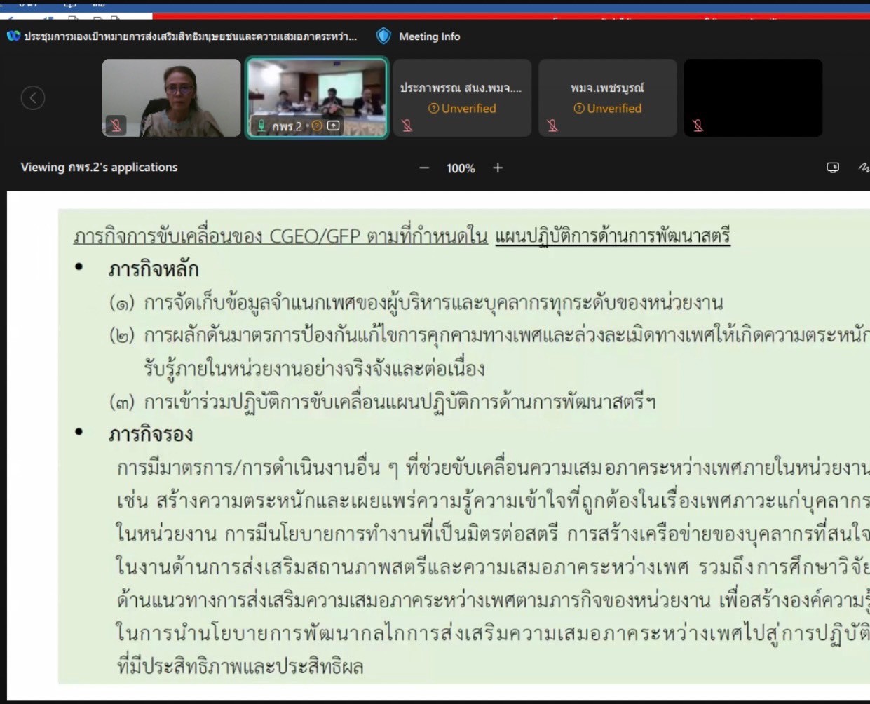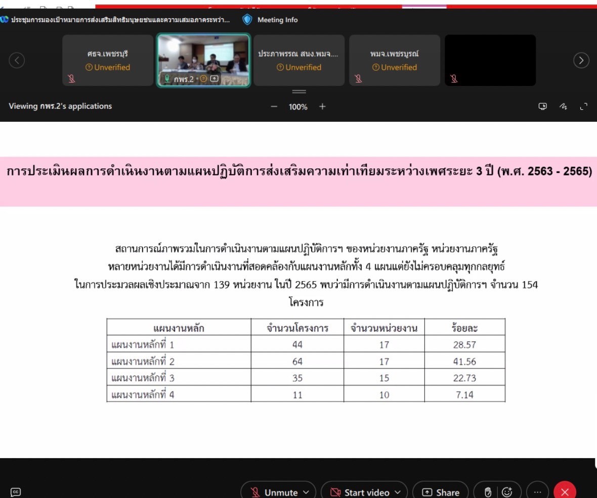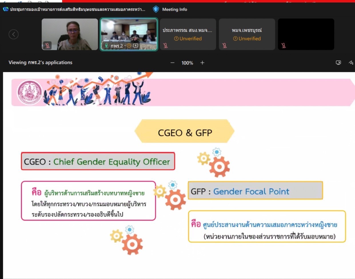 วันที่ 13 มีนาคม 2567 นายรุซลัญน์ เจ๊ะมิ ศึกษาธิการจังหวัดเพชรบุรี มอบหมายให้ นางยุพาภรณ์ จงเจริญ ผู้อำนวยการกลุ่มพัฒนาการศึกษา ร่วมประชุมทางไกลผ่านระบบอิเล็กทรอนิกส์ (Weber) การอภิปรายแลกเปลี่ยนความเห็นประเด็น “การมองเป้าหมายการส่งเสริมสิทธิมนุษยชนและความเสมอภาคระหว่างเพศในมิติด้านการศึกษาร่วมกันของศูนย์ประสานงานด้านความเสมอภาคระหว่างหญิงชาย (Gender Focal Point : GFP) ณ โรงแรมบียอนด์ สวีท บางพลัด กรุงเทพมหานครฯ