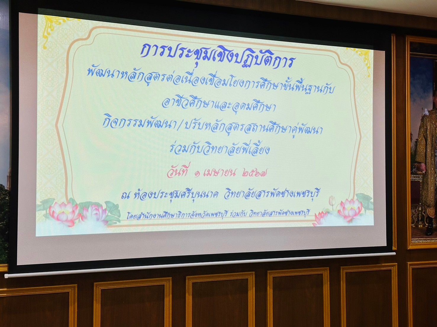 วันจันทร์ ที่ 1 เมษายน 2567 เวลา 08.30 น. นายรุซลัญน์ เจ๊ะมิ ศึกษาธิการจังหวัดเพชรบุรี มอบหมายให้ นางสุภาณี กิมกัว รองศึกษาธิการจังหวัดเพชรบุรี เป็นประธานในการประชุมเชิง ปฏิบัติการการดำเนินโครงการส่งเสริมเวทีและประชาคมเพื่อการจัดทำรูปแบบและการพัฒนาหลักสูตรต่อเนื่องเชื่อมโยงการศึกษาขั้นพื้นฐานกับอาชีวศึกษาและอุดมศึกษา ปีการศึกษา 2567 (กิจกรรมพัฒนาปรับหลักสูตรสถานศึกษาคู่พัฒนาร่วมกับวิทยาลัยพี่เลี้ยง) ณ ห้องประชุมศรีบุนนาค วิทยาลัยสารพัดช่างเพชรบุรี อำเภอเมืองฯ จังหวัดเพชรบุรี โดยมี นางยุพาภรณ์ จงเจริญ ผู้อำนวยการกลุ่มพัฒนาการศึกษา พร้อมด้วยคณะกรรมการพัฒนาหลักสูตรฯ ร่วมประชุมในครั้งนี้
