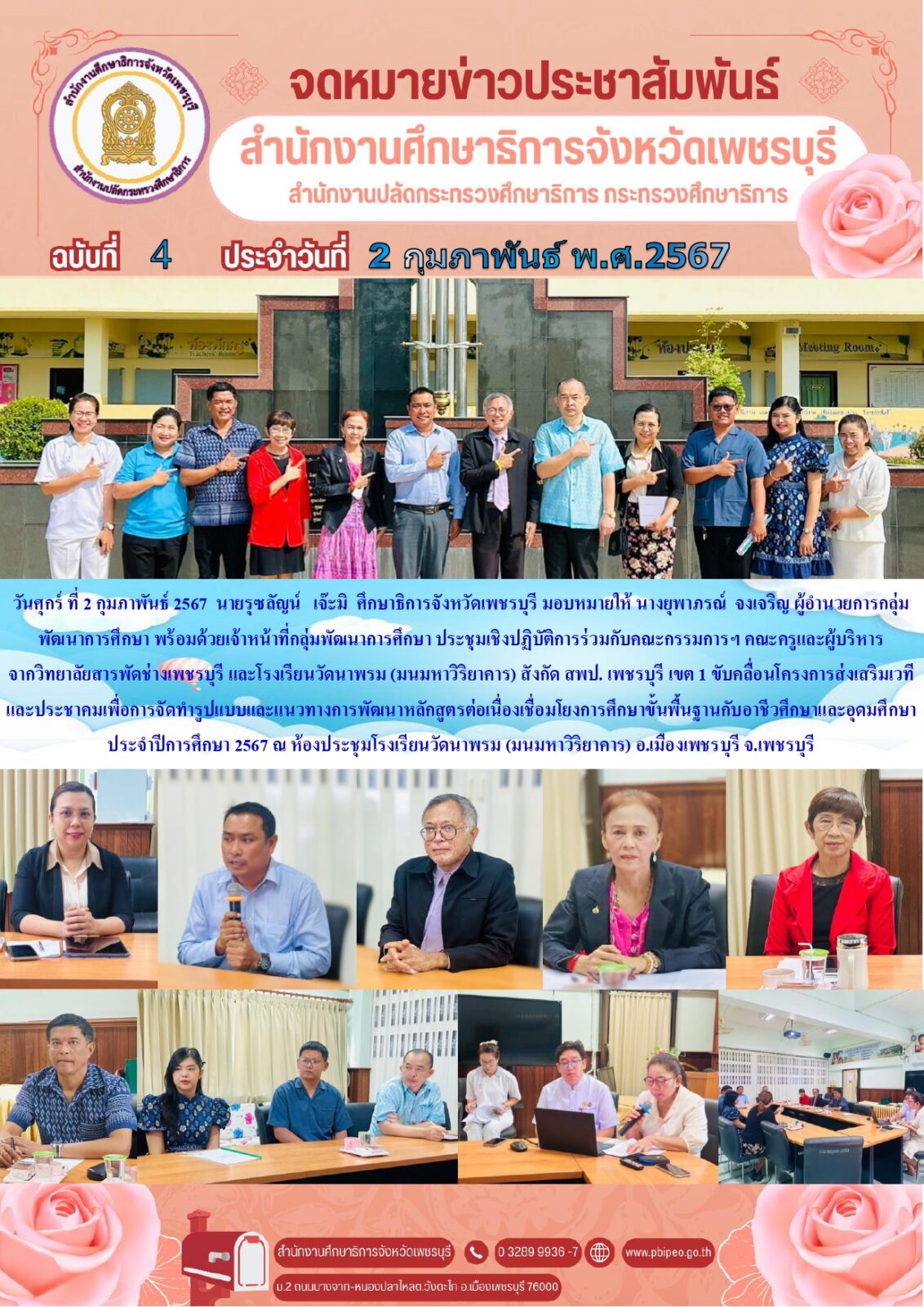 วันศุกร์ ที่ 2 กุมภาพันธ์ พ.ศ. 2567 นายรุซลัญน์ เจ๊ะมิ ศึกษาธิการจังหวัดเพชรบุรี มอบหมายให้ นางยุพาภรณ์ จงเจริญ ผู้อำนวยการกลุ่มพัฒนาการศึกษา พร้อมด้วยเจ้าหน้าที่กลุ่มพัฒนาการศึกษา ประชุมเชิงปฏิบัติการร่วมกับคณะกรรมการฯ คณะครูและผู้บริหาร จากวิทยาลัยสารพัดช่างเพชรบุรี และโรงเรียนวัดนาพรม (มนมหาวิริยาคาร) สังกัด สพป. เพชรบุรี เขต 1 ขับคลื่อนโครงการส่งเสริมเวทีและประชาคมเพื่อการจัดทำรูปแบบและแนวทางการพัฒนาหลักสูตรต่อเนื่องเชื่อมโยงการศึกษาขั้นพื้นฐานกับอาชีวศึกษาและอุดมศึกษา ประจำปีการศึกษา 2567 ณ ห้องประชุมโรงเรียนวัดนาพรม (มนมหาวิริยาคาร) อำเภอเมืองเพชรบุรี จังหวัดเพชรบุรี