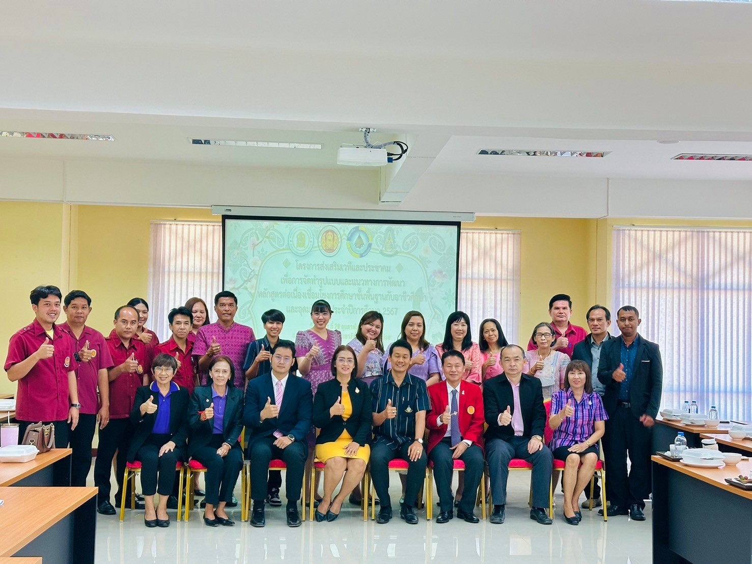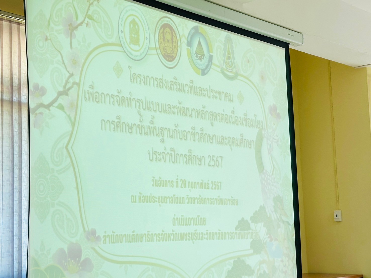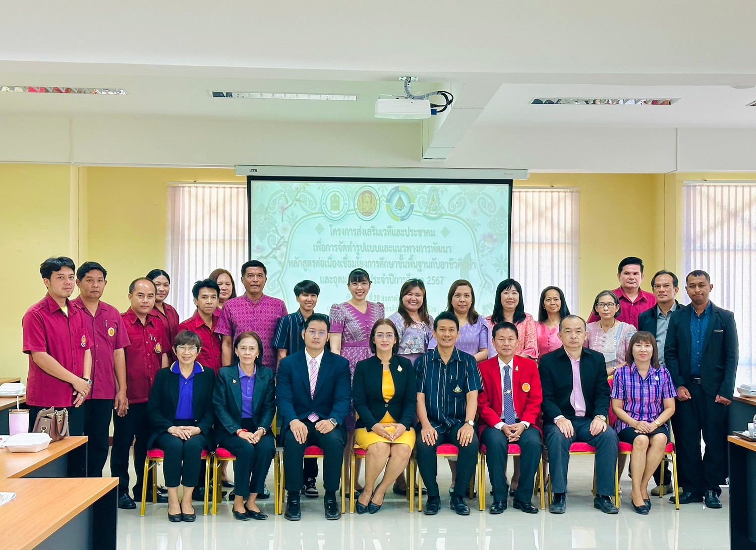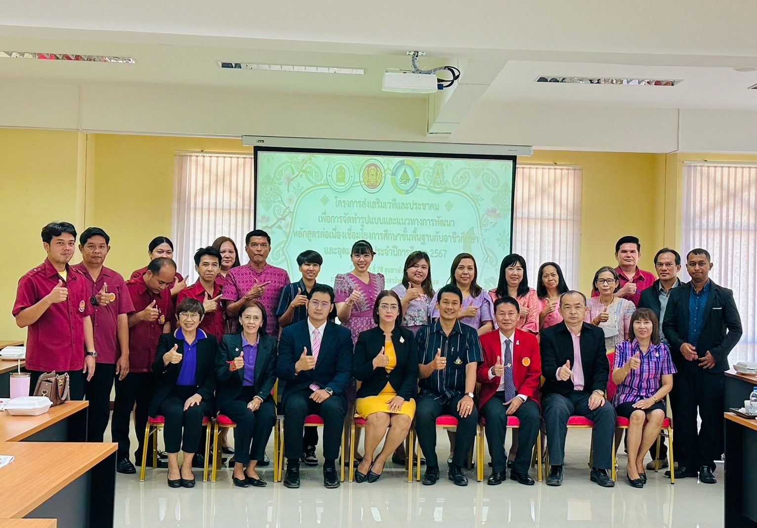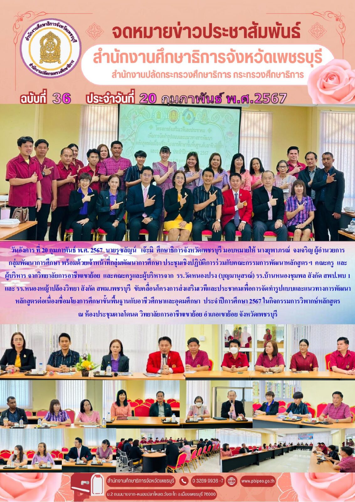 วันอังคาร ที่ 20 กุมภาพันธ์ พ.ศ. 2567 นายรุซลัญน์ เจ๊ะมิ ศึกษาธิการจังหวัดเพชรบุรี มอบหมายให้ นางยุพาภรณ์ จงเจริญ ผู้อำนวยการกลุ่มพัฒนาการศึกษา พร้อมด้วยเจ้าหน้าที่กลุ่มพัฒนาการศึกษา ประชุมเชิงปฏิบัติการร่วมกับคณะกรรมการพัฒนาหลักสูตรฯ คณะครู และผู้บริหาร จากวิทยาลัยการอาชีพเขาย้อย และคณะครูและผู้บริหารจาก รร.วัดหนองปรง (บุญมานุสรณ์) รร.บ้านหนองชุมพล สังกัด สพป.พบ 1 และ รร.หนองหญ้าปล้องวิทยา สังกัด สพม.เพชรบุรี ขับคลื่อนโครงการส่งเสริมเวทีและประชาคมเพื่อการจัดทำรูปแบบและแนวทางการพัฒนาหลักสูตรต่อเนื่องเชื่อมโยงการศึกษาขั้นพื้นฐานกับอาชีวศึกษาและอุดมศึกษา ประจำปีการศึกษา 2567 ในกิจกรรมการวิพากษ์หลักสูตร ณ ห้องประชุมตาลโตนด วิทยาลัยการอาชีพเขาย้อย อำเภอเขาย้อย จังหวัดเพชรบุรี