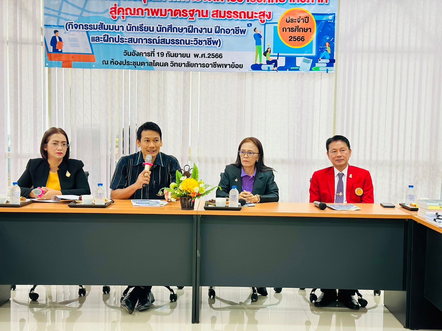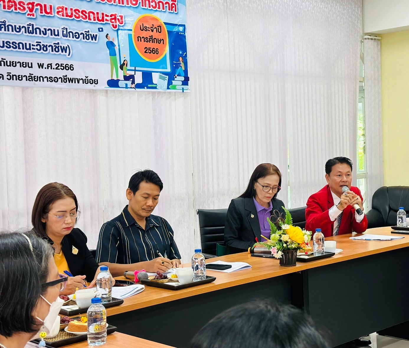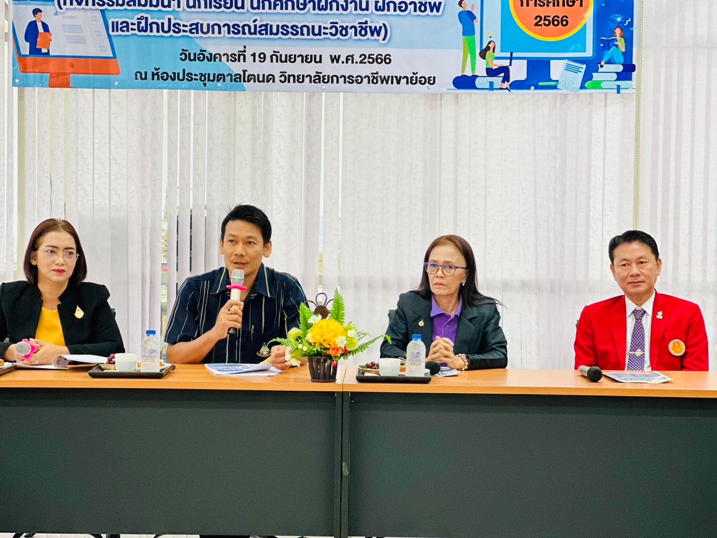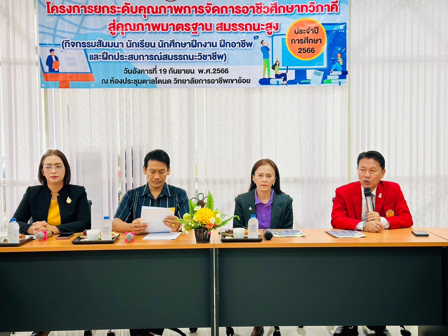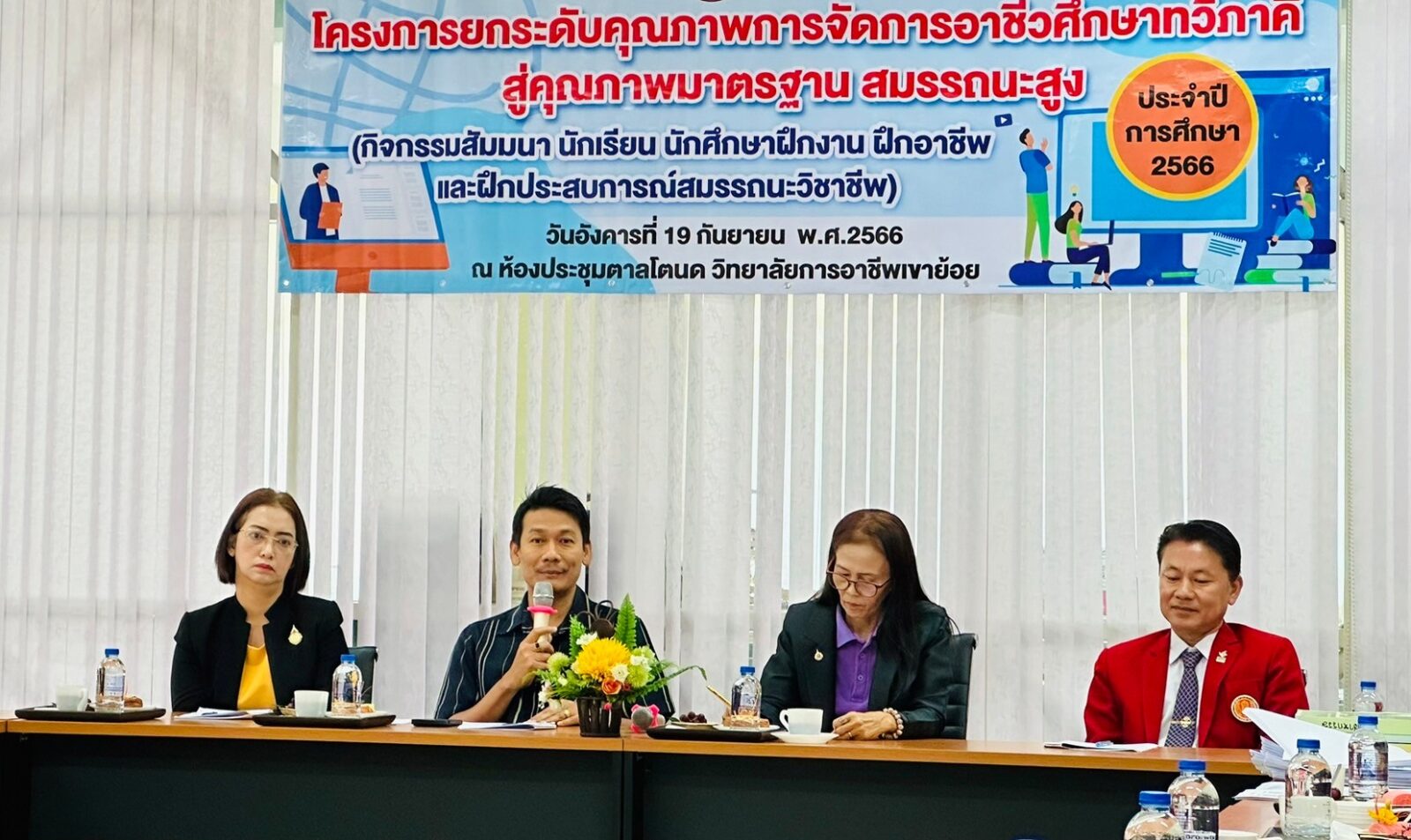 วันอังคาร ที่ 20 กุมภาพันธ์ พ.ศ. 2567 นายรุซลัญน์ เจ๊ะมิ ศึกษาธิการจังหวัดเพชรบุรี มอบหมายให้ นางยุพาภรณ์ จงเจริญ ผู้อำนวยการกลุ่มพัฒนาการศึกษา พร้อมด้วยเจ้าหน้าที่กลุ่มพัฒนาการศึกษา ประชุมเชิงปฏิบัติการร่วมกับคณะกรรมการพัฒนาหลักสูตรฯ คณะครู และผู้บริหาร จากวิทยาลัยการอาชีพเขาย้อย และคณะครูและผู้บริหารจาก รร.วัดหนองปรง (บุญมานุสรณ์) รร.บ้านหนองชุมพล สังกัด สพป.พบ 1 และ รร.หนองหญ้าปล้องวิทยา สังกัด สพม.เพชรบุรี ขับคลื่อนโครงการส่งเสริมเวทีและประชาคมเพื่อการจัดทำรูปแบบและแนวทางการพัฒนาหลักสูตรต่อเนื่องเชื่อมโยงการศึกษาขั้นพื้นฐานกับอาชีวศึกษาและอุดมศึกษา ประจำปีการศึกษา 2567 ในกิจกรรมการวิพากษ์หลักสูตร ณ ห้องประชุมตาลโตนด วิทยาลัยการอาชีพเขาย้อย อำเภอเขาย้อย จังหวัดเพชรบุรี