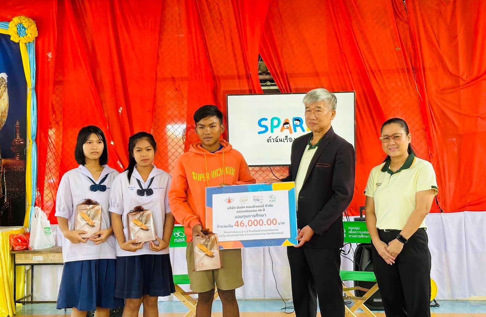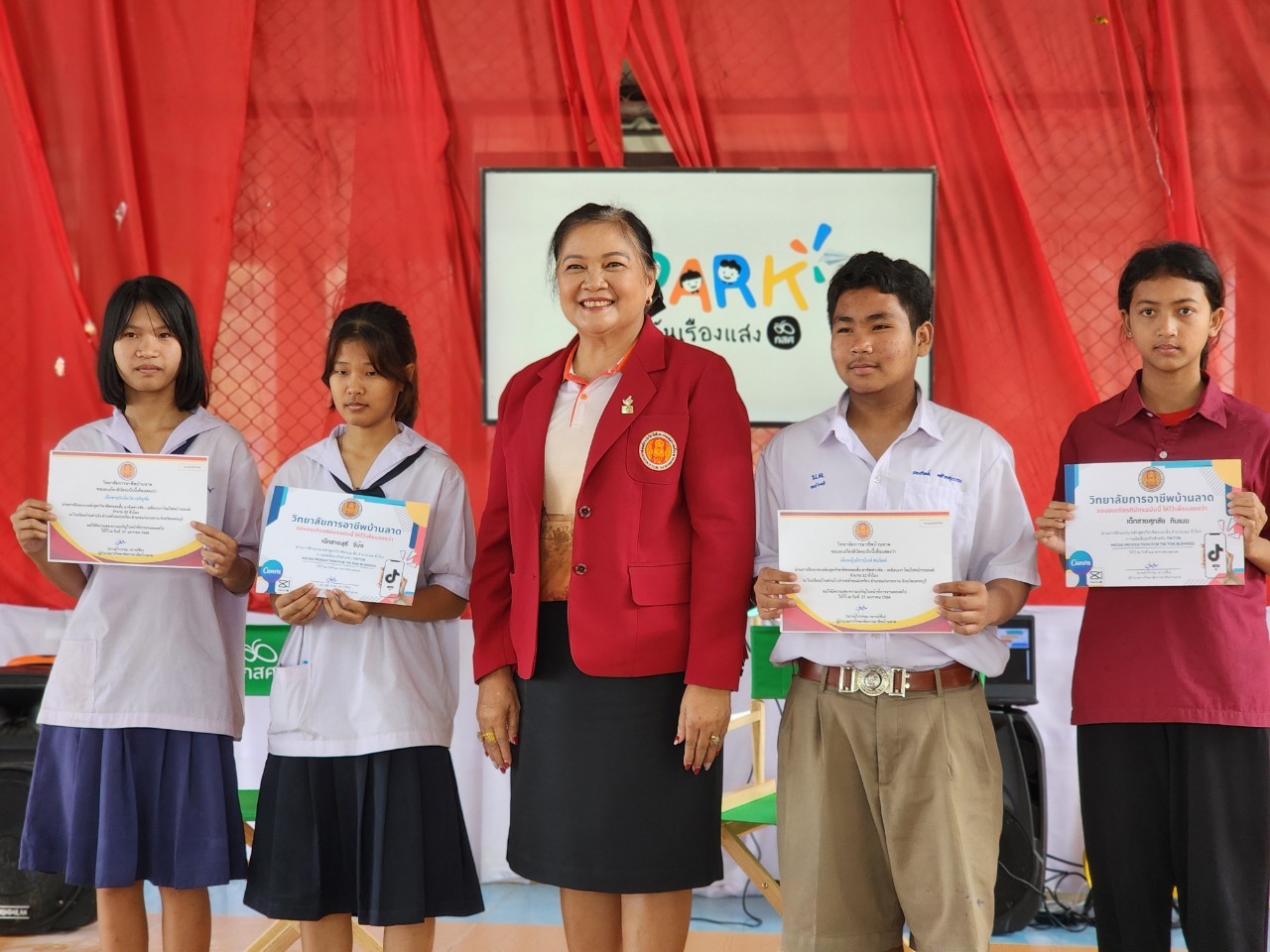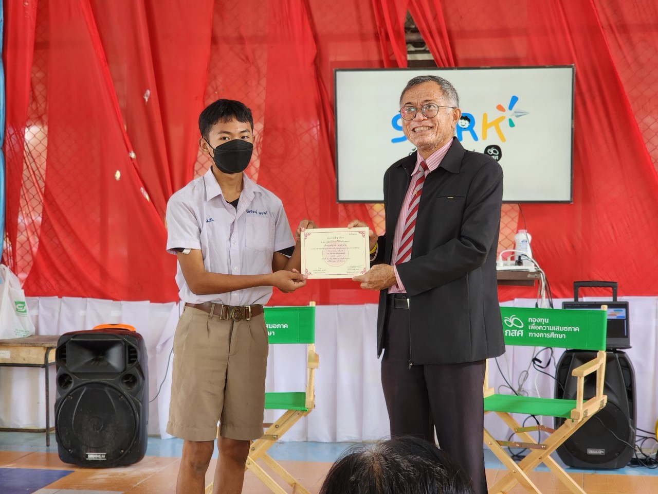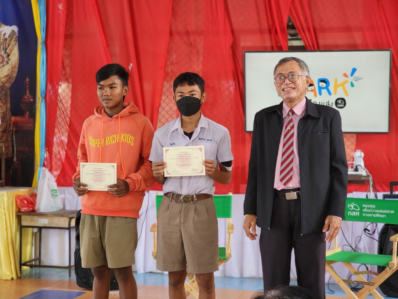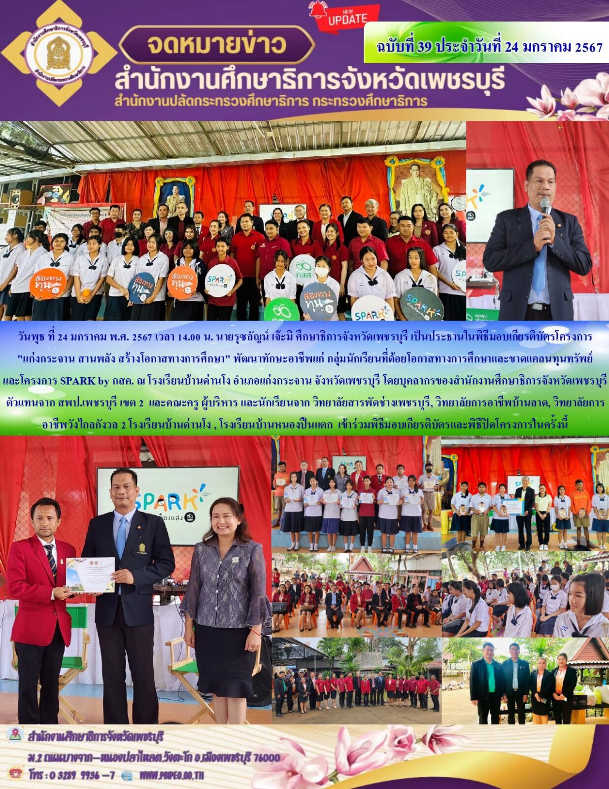 วันพุธ ที่ 24 มกราคม พ.ศ. 2567 เวลา 14.00 น. นายรุซลัญน์ เจ๊ะมิ ศึกษาธิการจังหวัดเพชรบุรี เป็นประธานในพิธีมอบเกียรติบัตรโครงการ “แก่งกระจาน สานพลัง สร้างโอกาสทางการศึกษา” พัฒนาทักษะอาชีพแก่ กลุ่มนักเรียนที่ด้อยโอกาสทางการศึกษาและขาดแคลนทุนทรัพย์ และโครงการ SPARK by กสค. ณ โรงเรียนบ้านด่านโง อำเภอแก่งกระจาน จังหวัดเพชรบุรี โดยบุคลากรของสำนักงานศึกษาธิการจังหวัดเพชรบุรี ตัวแทนจาก สพป.เพชรบุรี เขต 2 และคณะครู ผู้บริหาร และนักเรียนจาก วิทยาลัยสารพัดช่างเพชรบุรี, วิทยาลัยการอาชีพบ้านลาด, วิทยาลัยการอาชีพวังไกลกังวล 2 โรงเรียนบ้านด่านโง , โรงเรียนบ้านหนองปืนแตก เข้าร่วมพิธีมอบเกียรติบัตรและพิธีปิดโครงการในครั้งนี้