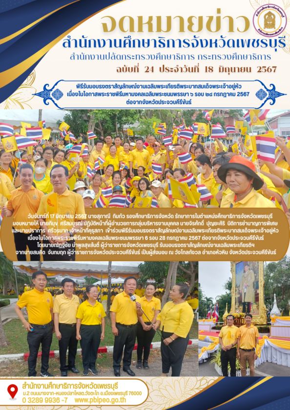 วันจันทร์ที่ 17 มิถุนายน 2567 นางสุภาณี กิมกัว รองศึกษาธิการจังหวัด รักษาการในตำแหน่งศึกษาธิการจังหวัดเพชรบุรี มอบหมายให้นายภิมุข ศรีสมบูรณ์ ปฏิบัติหน้าที่ผู้อำนวยการกลุ่มบริหารงานบุคคล นายจิรศักดิ์ ปุญยะศิริ นิติการชำนาญการพิเศษ และนายปราการ ศรีวรนาถ เจ้าหน้าที่คุรุสภา