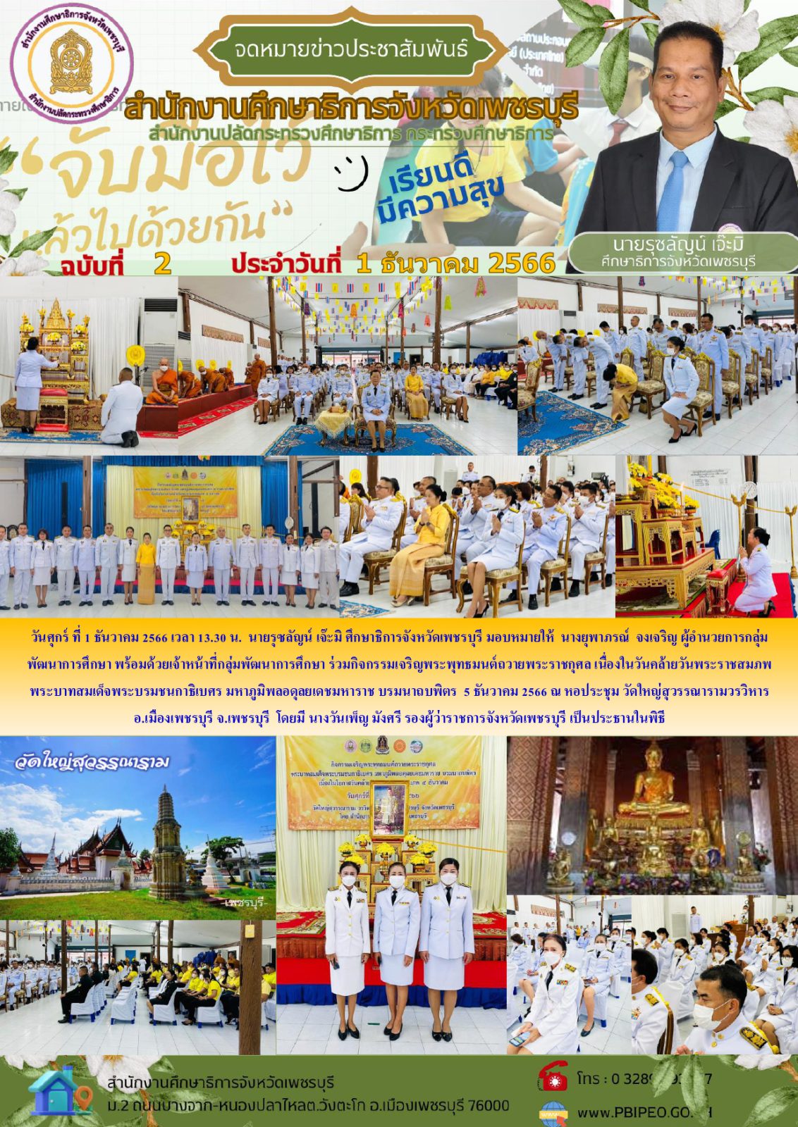 วันศุกร์ ที่ 1 ธันวาคม 2566 เวลา 13.30 น. นายรุซลัญน์ เจ๊ะมิ ศึกษาธิการจังหวัดเพชรบุรี มอบหมายให้ นางยุพาภรณ์ จงเจริญ ผู้อำนวยการกลุ่มพัฒนาการศึกษา พร้อมด้วยเจ้าหน้าที่กลุ่มพัฒนาการศึกษา ร่วมกิจกรรมเจริญพระพุทธมนต์ถวายพระราชกุศล เนื่องในวันคล้ายวันพระราชสมภพ พระบาทสมเด็จพระบรมชนกาธิเบศร มหาภูมิพลอดุลยเดชมหาราช บรมนาถบพิตร 5 ธันวาคม 2566 ณ หอประชุม วัดใหญ่สุวรรณารามวรวิหาร อ.เมืองเพชรบุรี จ.เพชรบุรี โดยมี นางวันเพ็ญ มังศรี รองผู้ว่าราชการจังหวัดเพชรบุรี เป็นประธานในพิธี
