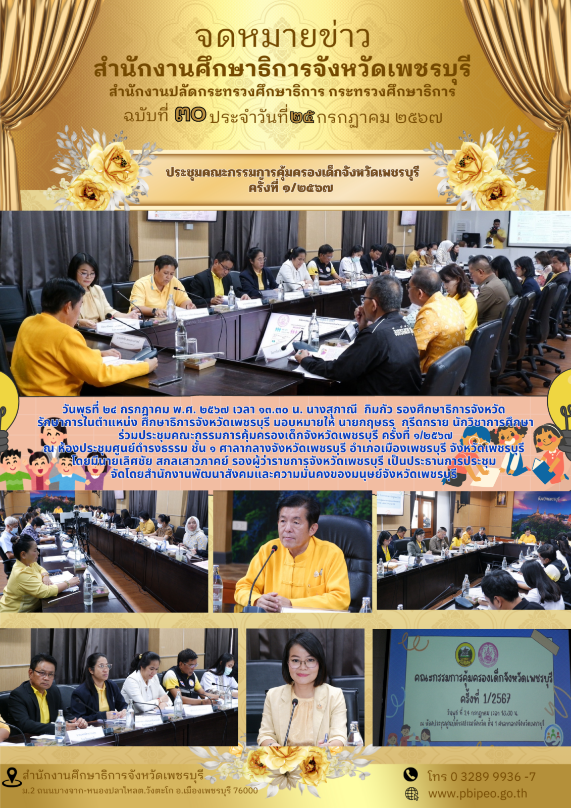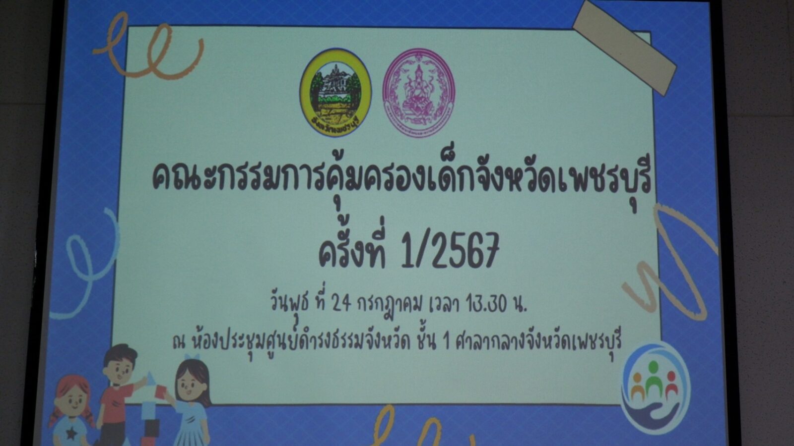วันพุธที่ ๒๔ กรกฎาคม พ.ศ. ๒๕๖๗ เวลา ๑๓.๓๐ น. นางสุภาณี กิมกัว รองศึกษาธิการจังหวัด รักษาการในตำแหน่ง ศึกษาธิการจังหวัดเพชรบุรี มอบหมายให้ นายกฤษธร กรีดกราย นักวิชาการศึกษา ร่วมประชุมคณะกรรมการคุ้มครองเด็กจังหวัดเพชรบุรี ครั้งที่ ๑/๒๕๖๗ ณ ห้องประชุมศูนย์ดำรงธรรม ชั้น ๑ ศาลากลางจังหวัดเพชรบุรี อำเภอเมืองเพชรบุรี จังหวัดเพชรบุรี โดยมีนายเลิศชัย สกลเสาวภาคย์ รองผู้ว่าราชการจังหวัดเพชรบุรี เป็นประธานการประชุม จัดโดยสำนักงานพัฒนาสังคมและความมั่นคงของมนุษย์จังหวัดเพชรบุรี