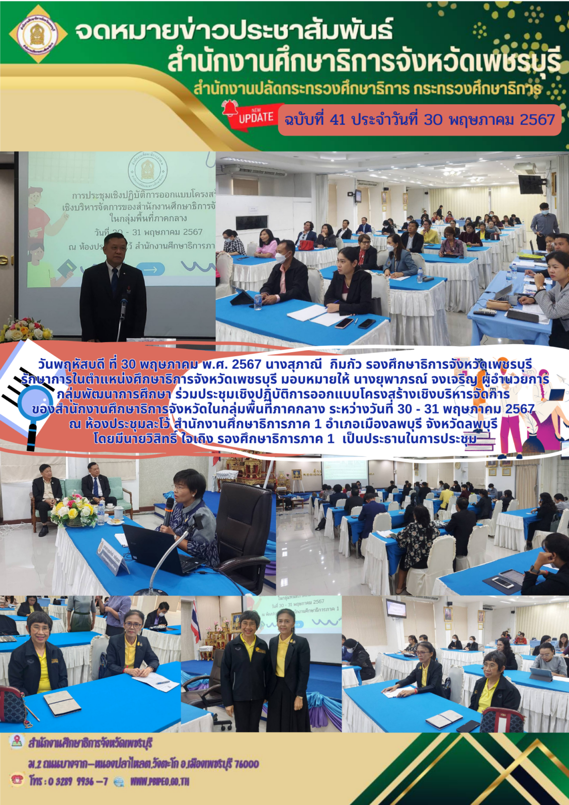 วันพฤหัสบดี ที่ 30 พฤษภาคม พ.ศ. 2567 นางสุภาณี กิมกัว รองศึกษาธิการจังหวัดเพชรบุรี รักษาการในตำแหน่งศึกษาธิการจังหวัดเพชรบุรี มอบหมายให้ นางยุพาภรณ์ จงเจริญ ผู้อำนวยการกลุ่มพัฒนาการศึกษา ร่วมประชุมเชิงปฏิบัติการออกแบบโครงสร้างเชิงบริหารจัดการของสำนักงานศึกษาธิการจังหวัดในกลุ่มพื้นที่ภาคกลาง ระหว่างวันที่ 30 – 31 พฤษภาคม 2567 ณ ห้องประชุมละโว้ สำนักงานศึกษาธิการภาค 1 อำเภอเมืองลพบุรี จังหวัดลพบุรีโดยมีนายวิสิทธิ์ ใจเถิง รองศึกษาธิการภาค 1 เป็นประธานในการประชุม