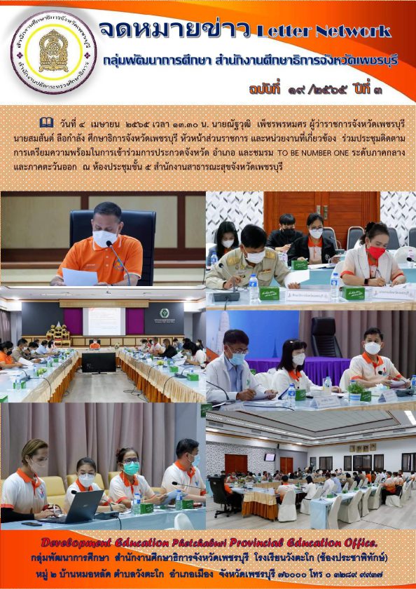 13.30 น. นายณัฐวุฒิ เพ็ชรพรหมศร ผู้ว่าราชการจังหวัดเพชรบุรี นายสมสันต์ ลือกำลัง ศึกษาธิการจังหวัดเพชรบุรี หัวหน้าส่วนราชการ และหน่วยงานที่เกี่ยวข้อง ร่วมประชุมติดตามการเตรียมความพร้อมในการเข้าร่วมการประกวดจังหวัด อำเภอ และชมรม TO BE NUMBER ONE ระดับภาคกลางและภาคตะวันออก ณ ห้องประชุมชั้น 5 สำนักงานสาธารณะสุขจังหวัดเพชรบุรี