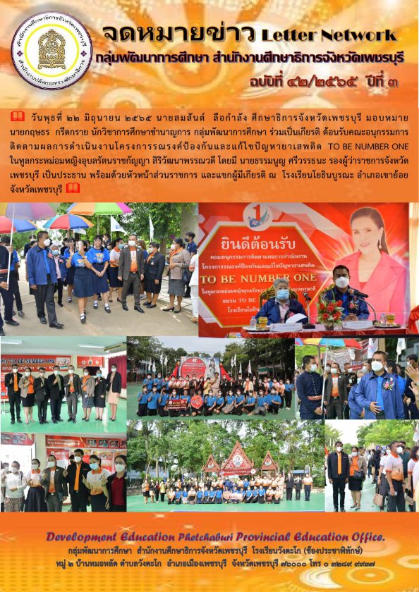 วันพุธที่ 22 มิถุนายน 2565 นายสมสันต์ ลือกำลัง ศึกษาธิการจังหวัดเพชรบุรี มอบหมาย นายกฤษธร กรีดกราย นักวิชาการศึกษาชำนาญการ กลุ่มพัฒนาการศึกษา ร่วมเป็นเกียรติ ต้อนรับคณะอนุกรรมการ ติดตามผลการดำเนินงานโครงการรณรงค์ป้องกันและแก้ไขปัญหายาเสพติด TO BE NUMBER ONE ในทูลกระหม่อมหญิงอุบลรัตนราชกัญญา สิริวัฒนาพรรณวดี โดยมี นายธรรมนูญ ศรีวรรธนะ รองผู้ว่าราชการจังหวัดเพชรบุรี เป็นประธาน พร้อมด้วยหัวหน้าส่วนราชการ และแขกผู้มีเกียรติ ณ โรงเรียนโยธินบูรณะ อำเภอเขาย้อย จังหวัดเพชรบุรี