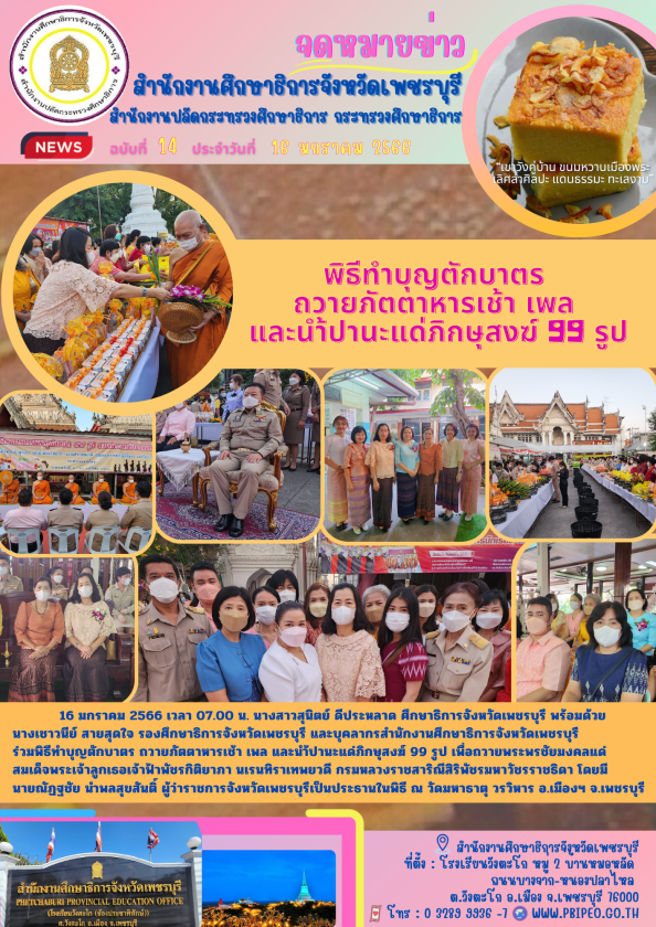(ศธจ.เพชรบุรี)พิธีทำบุญตักบาตร ถวายภัตตาหารเช้า เพล และนำ้ปานะแด่ภิกษุสงฆ์ 99 รูป