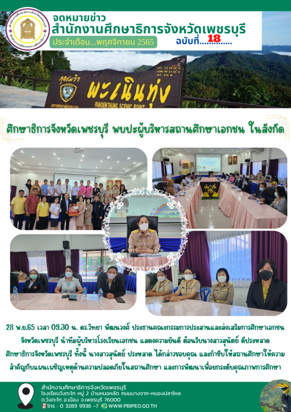 28 พ.ย.65 เวลา 09.30 น. ดร.วิทยา พัฒนวงศ์ ประธานคณะกรรมการประสานและส่งเสริมการศึกษาเอกชนจังหวัดเพชรบุรี นำทีมผู้บริหารโรงเรียนเอกชน แสดงความยินดี ต้อนรับนางสาวสุนิตย์ ดีประหลาด ศึกษาธิการจังหวัดเพชรบุรี ทั้งนี้ นางสาวสุนิตย์ ประหลาด ได้กล่าวขอบคุณ และกำชับให้สถานศึกษาให้ความสำคัญกับแผนเผชิญเหตุด้านความปลอดภัยในสถานศึกษา และการพัฒนาเพื่อยกระดับคุณภาพการศึกษา