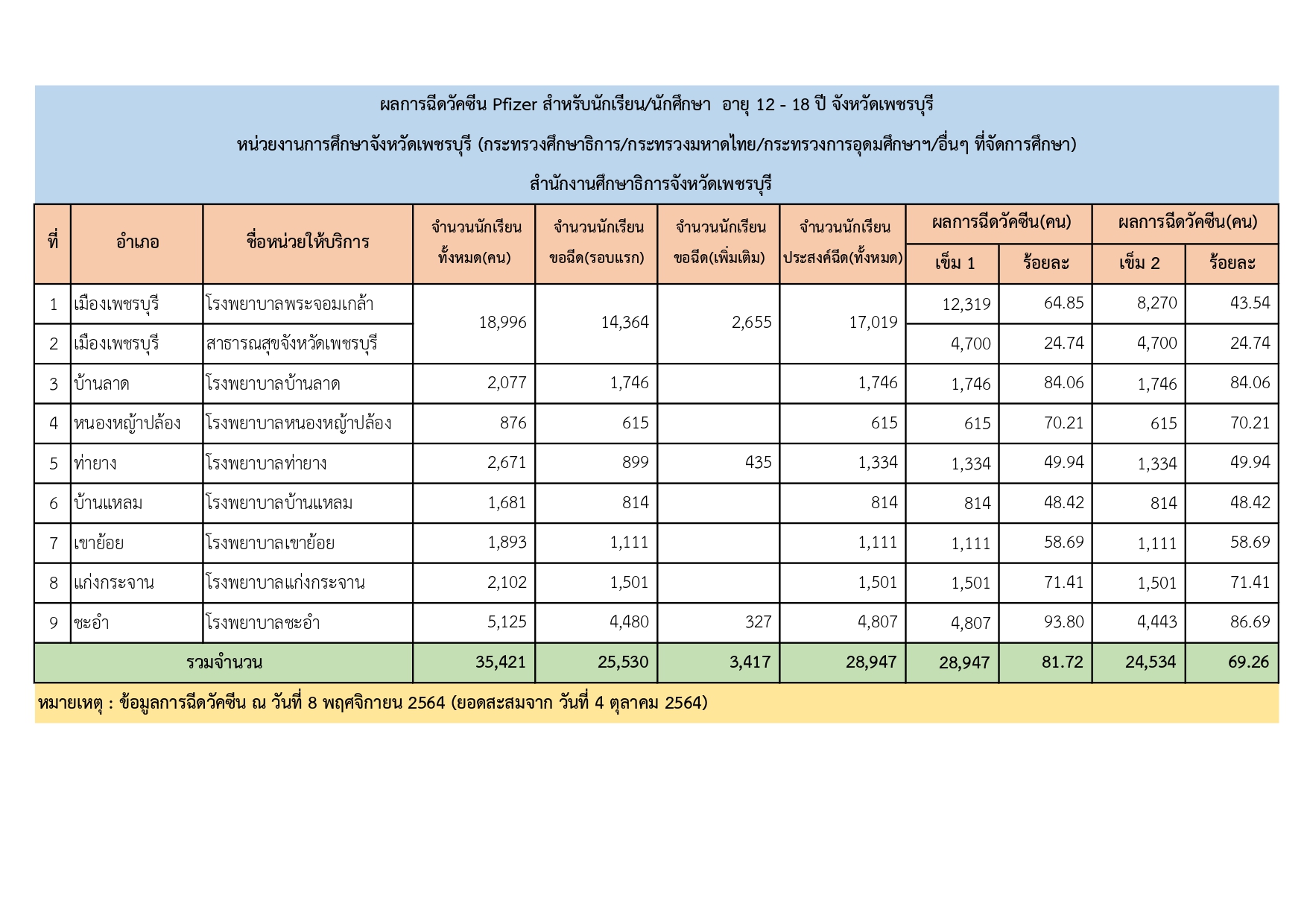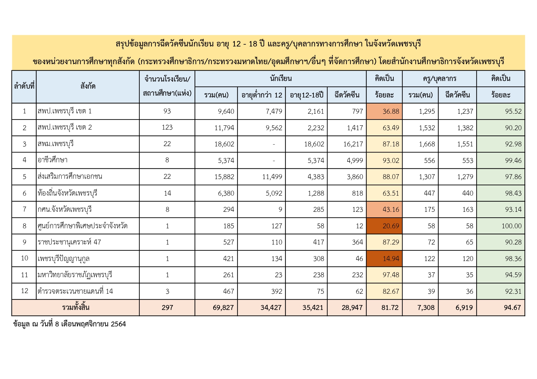 สรุปข้อมูลการฉีดวัคซีนนักเรียน อายุ 12 – 18 ปี และครู/บุคลากรทางการศึกษา ในจังหวัดเพชรบุรี ของหน่วยงานการศึกษาทุกสังกัด (กระทรวงศึกษาธิการ/กระทรวงมหาดไทย/อุดมศึกษาฯ/อื่นๆ ที่จัดการศึกษา) โดยสำนักงานศึกษาธิการจังหวัดเพชรบุรี