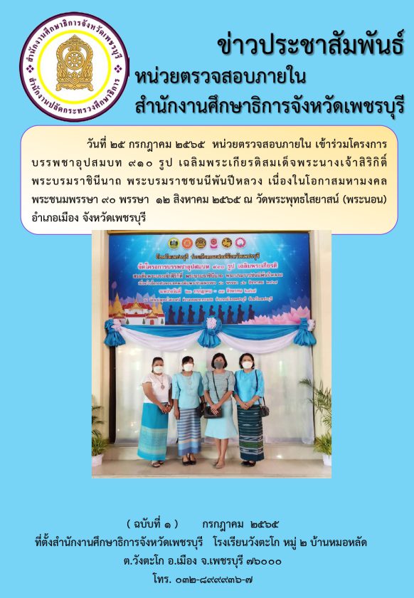 วันที่ 25 กรกฎาคม 2565 หน่วยตรวจสอบภายใน เข้าร่วมโครงการบรรพชาอุปสมบท 910 รูป เฉลิมพระเกียรติสมเด็จพระนางเจ้าสิริกิติ์ พระบรมราชินีนาถ พระบรมราชชนนีพันปีหลวง เนื่องในโอกาสมหามงคลพระชนมพรรษา 90 พรรษา 12 สิงหาคม 2565 ณ วัดพระพุทธไสยาสน์ (พระนอน) อำเภอเมือง จังหวัดเพชรบุรี