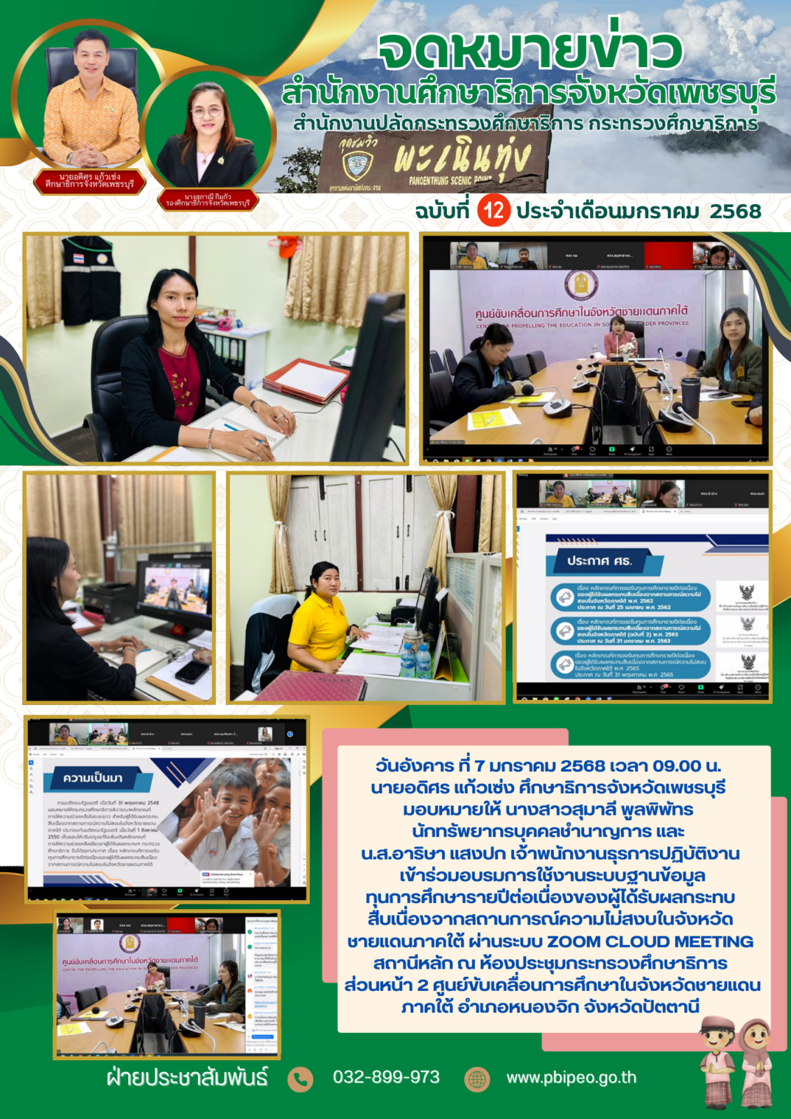 วันอังคาร ที่ 7 มกราคม 2568 เวลา 09.00 น. นายอดิศร แก้วเซ่ง ศึกษาธิการจังหวัดเพชรบุรี มอบหมายให้ นางสาวสุมาลี พูลพิพัทร นักทรัพยากรบุคคลชำนาญการ และ น.ส.อาริษา แสงปก เจ้าพนักงานธุรการปฏิบัติงาน เข้าร่วมอบรมการใช้งานระบบฐานข้อมูลทุนการศึกษารายปีต่อเนื่องของผู้ได้รับผลกระทบสืบเนื่องจากสถานการณ์ความไม่สงบในจังหวัดชายแดนภาคใต้ ผ่านระบบ ZOOM CLOUD MEETING สถานีหลัก ณ ห้องประชุมกระทรวงศึกษาธิการ ส่วนหน้า 2 ศูนย์ขับเคลื่อนการศึกษาในจังหวัดชายแดนภาคใต้ อำเภอหนองจิก จังหวัดปัตตานี