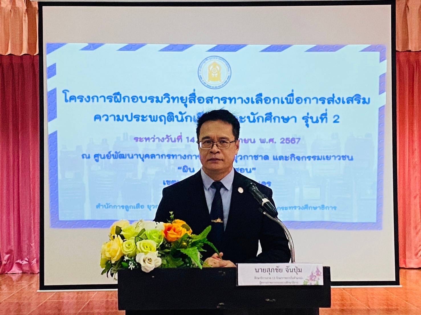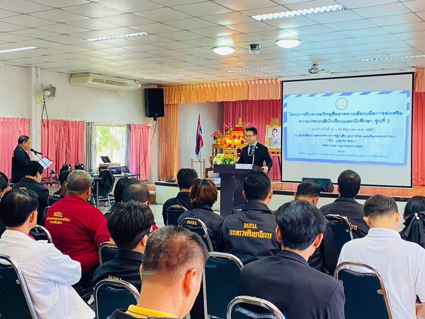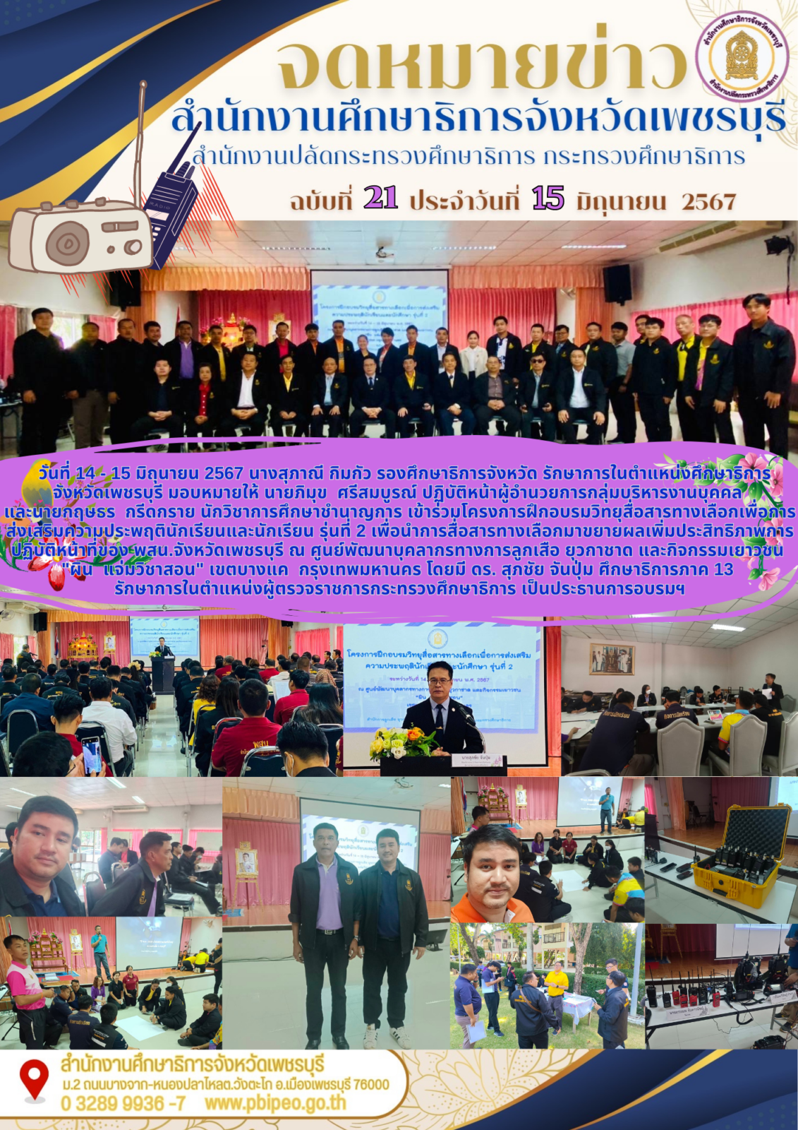 วันที่ 14- 15 มิถุนายน 2567 นางสุภาณี กิมกัว รองศึกษาธิการจังหวัด รักษาการในตำแหน่งศึกษาธิการจังหวัดเพชรบุรี มอบหมายให้ นายภิมุข ศรีสมบูรณ์ ปฏิบัติหน้าผอ.กลุ่มบริหารงานบุคคล และนายกฤษธร กรีดกราย นักวิชาการศึกษาชำนาญการ เข้าร่วมโครงการฝึกอบรมวิทยุสื่อสารทางเลือกเพื่อการส่งเสริมความประพฤตินักเรียนและนักเรียน รุ่นที่ 2 เพื่อนำการสื่อสารทางเลือกมาขยายผลเพิ่มประสิทธิภาพการปฏิบัติหน้าที่ของ พสน.จังหวัดเพชรบุรี ณ ศูนย์พัฒนาบุคลากรทางการลูกเสือ ยุวกาชาด และกิจกรรมเยาวชน “ผิน แจ่มวิชาสอน” เขตบางแค กรุงเทพมหานคร โดยมี ดร. สุภชัย จันปุ่ม ศึกษาธิการภาค 13 รักษาการในตำแหน่งผู้ตรวจราชการกระทรวงศึกษาธิการ เป็นประธานการอบรมฯ