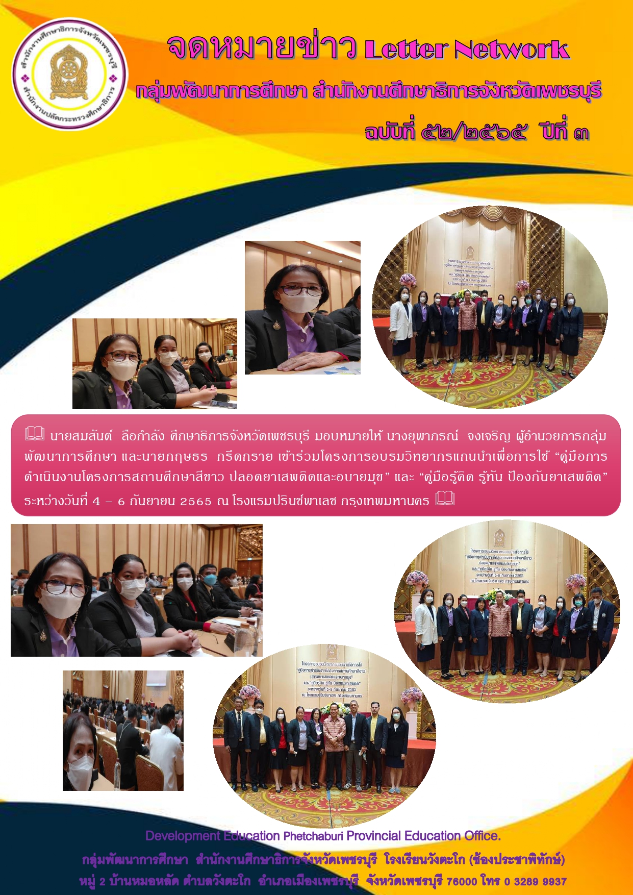 นายสมสันต์ ลือกำลัง ศึกษาธิการจังหวัดเพชรบุรี มอบหมายให้ นางยุพาภรณ์ จงเจริญ ผู้อำนวยการกลุ่มพัฒนาการศึกษา และนายกฤษธร กรีดกราย เข้าร่วมโครงการอบรมวิทยากรแกนนำเพื่อการใช้ “คู่มือการดำเนินงานโครงการสถานศึกษาสีขาว ปลอดยาเสพติดและอบายมุข” และ “คู่มือรู้คิด รู้ทัน ป้องกันยาเสพติด” ระหว่างวันที่ 4 – 6 กันยายน 2565 ณ โรงแรมปรินซ์พาเลซ กรุงเทพมหานคร