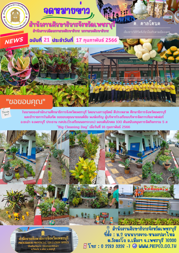 ? ขอบคุณ สำนักงานศึกษาธิการจังหวัดเพชรบุรีขอขอบคุณโรงเรียนบริหารจัดการภัยอาฟเฟอร์ อ.ชะอำ สนับสนุนต้นโกศล 100 ต้น และโรงเรียนแก่นจันทร์วิทยา อ.ชะอำสนับสนุนต้นเฟื่องฟ้า การจัดกิจกรรม 5 ส. ของสำนักงาน เมื่อ 16 กุมภาพันธ์ 2566