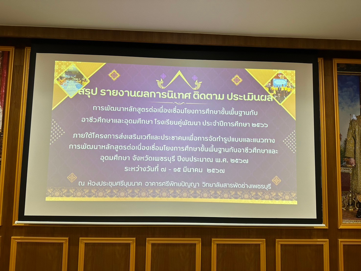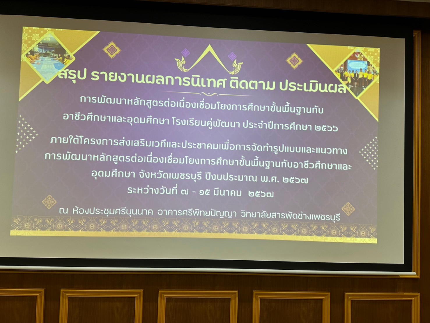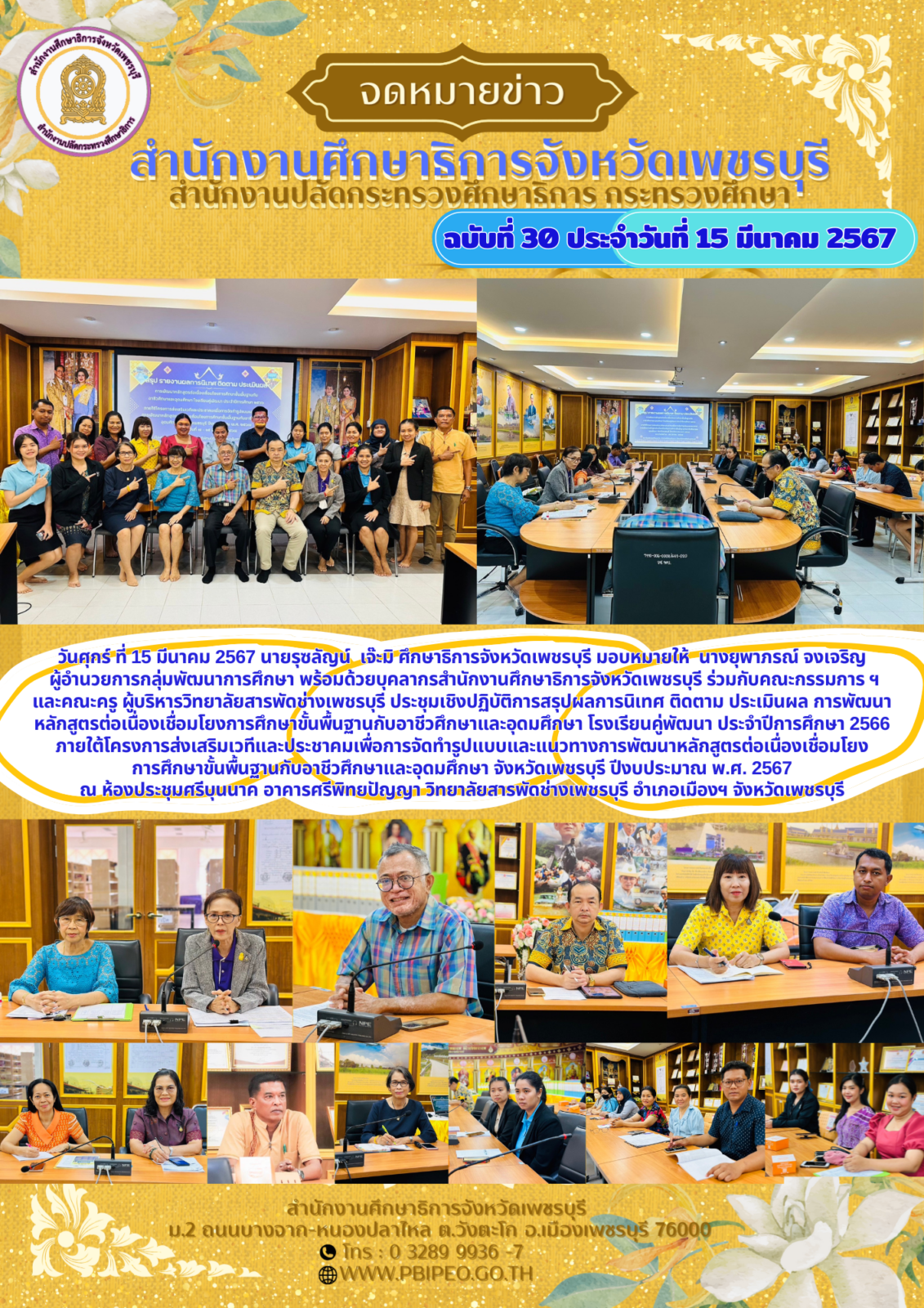 วันศุกร์ ที่ 15 มีนาคม 2567 นายรุซลัญน์ เจ๊ะมิ ศึกษาธิการจังหวัดเพชรบุรี มอบหมายให้ นางยุพาภรณ์ จงเจริญ ผู้อำนวยการกลุ่มพัฒนาการศึกษา พร้อมด้วยบุคลากรสำนักงานศึกษาธิการจังหวัดเพชรบุรี ร่วมกับคณะกรรมการ ฯ และคณะครู ผู้บริหารวิทยาลัยสารพัดช่างเพชรบุรี ประชุมเชิงปฏิบัติการสรุปผลการนิเทศ ติดตาม ประเมินผล การพัฒนาหลักสูตรต่อเนื่องเชื่อมโยงการศึกษาขั้นพื้นฐานกับอาชีวศึกษาและอุดมศึกษา โรงเรียนคู่พัฒนา ประจำปีการศึกษา 2566 ภายใต้โครงการส่งเสริมเวทีและประชาคมเพื่อการจัดทำรูปแบบและแนวทางการพัฒนาหลักสูตรต่อเนื่องเชื่อมโยงการศึกษาขั้นพื้นฐานกับอาชีวศึกษาและอุดมศึกษา จังหวัดเพชรบุรี ปีงบประมาณ พ.ศ. 2567 ณ ห้องประชุมศรีบุนนาค อาคารศรีพิทยปัญญา วิทยาลัยสารพัดช่างเพชรบุรี อำเภอเมืองฯ จังหวัดเพชรบุรี