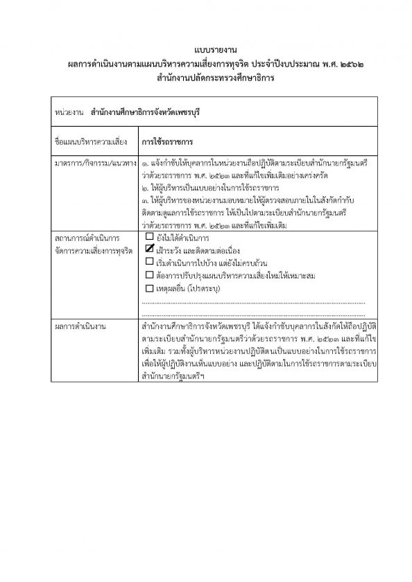 แบบรายงานผลการดำเนินงานตามแผนบริหารความเสี่ยงการทุจริต ประจำปีงบประมาณ พ.ศ. 2562 สำนักงานปลัดกระทรวงศึกษาธิการ
