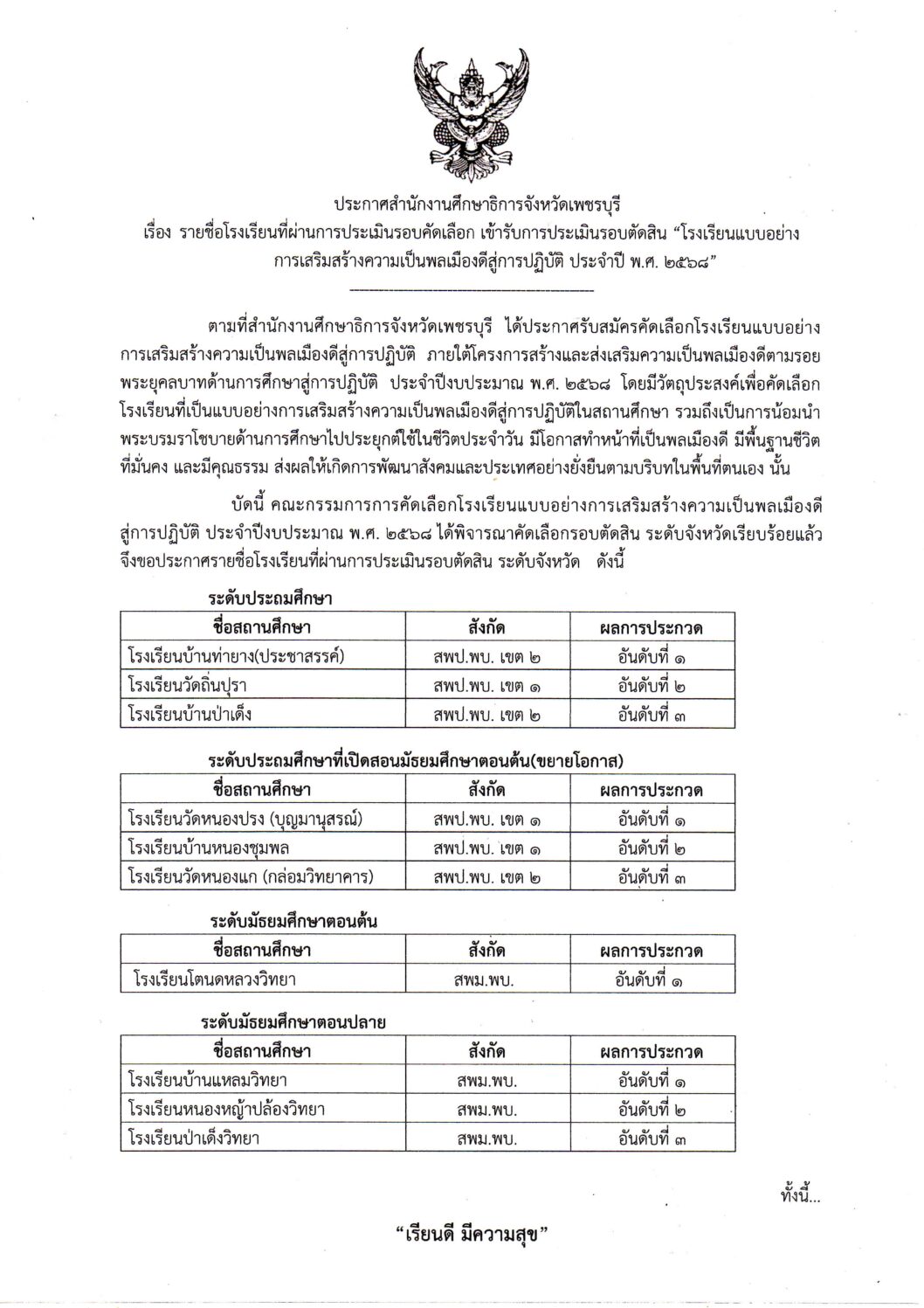 ประกาศสำนักงานศึกษาธิการจังหวัดเพชรบุรี เรื่อง ผลการประ […]