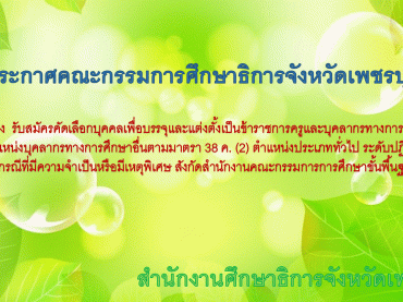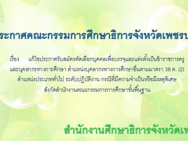ประกาศคณะกรรมการศึกษาธิการจังหวัดเพชรบุรี เรื่อง แก้ไขประกาศรับสมัครคัดเลือกบุคคลเพื่อบรรจุและแต่งตั้งเป็นข้าราชการครูและบุคลากร ทางการศึกษา ตำแหน่งบุคลากรทางการศึกษาอื่นตามมาตรา 38 ค. (2) ตำแหน่งประเภททั่วไป ระดับปฏิบัติงาน กรณีที่มีความจำเป็นหรือมีเหตุพิเศษ สังกัดสำนักงานคณะกรรมการการศึกษาขั้นพื้นฐาน